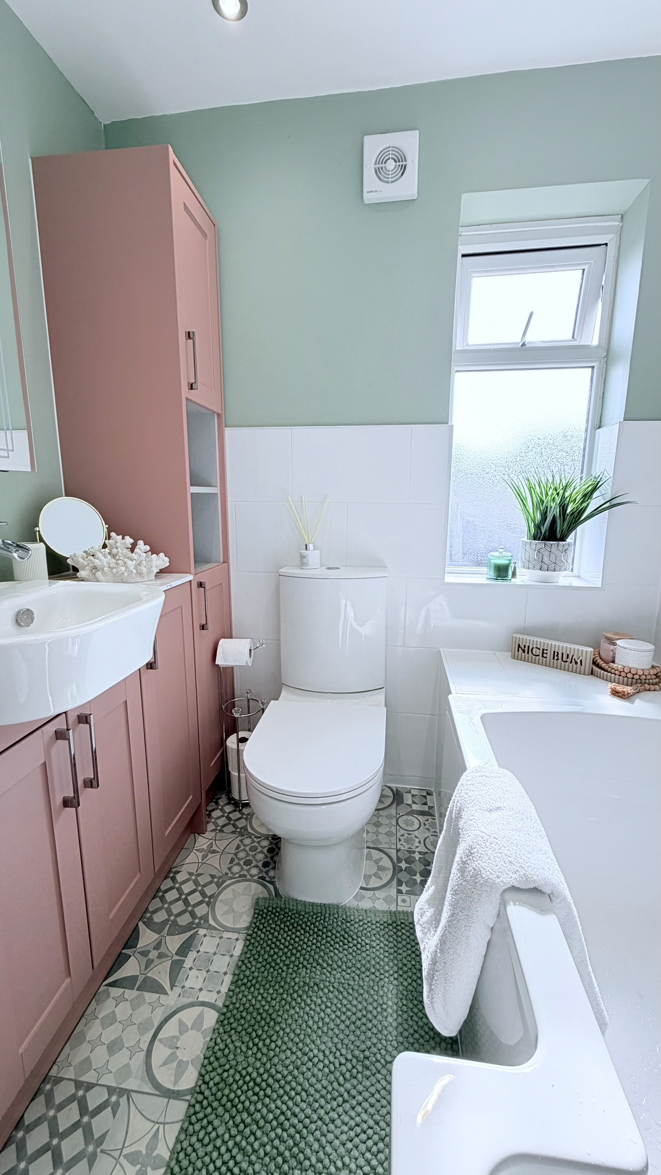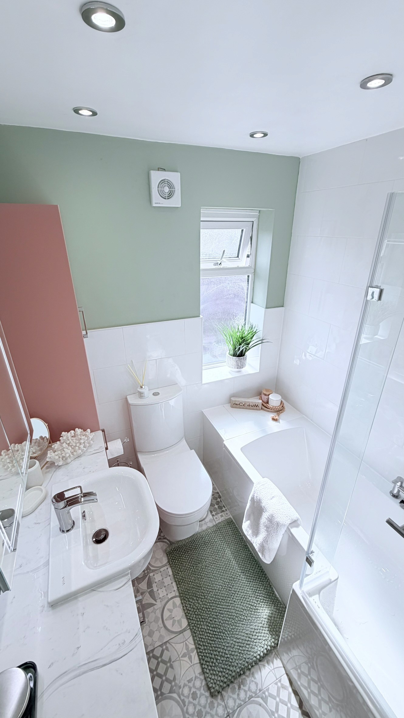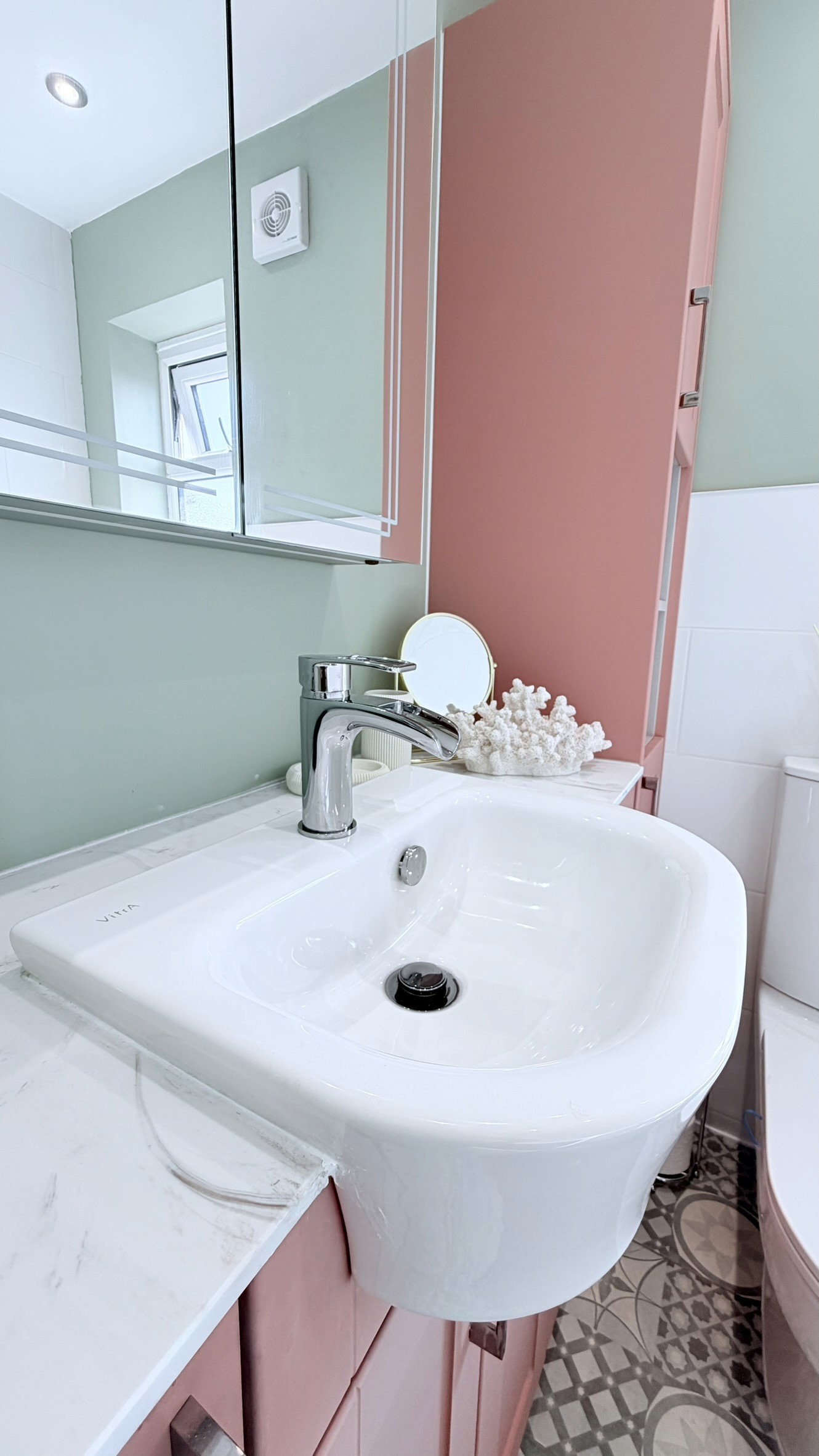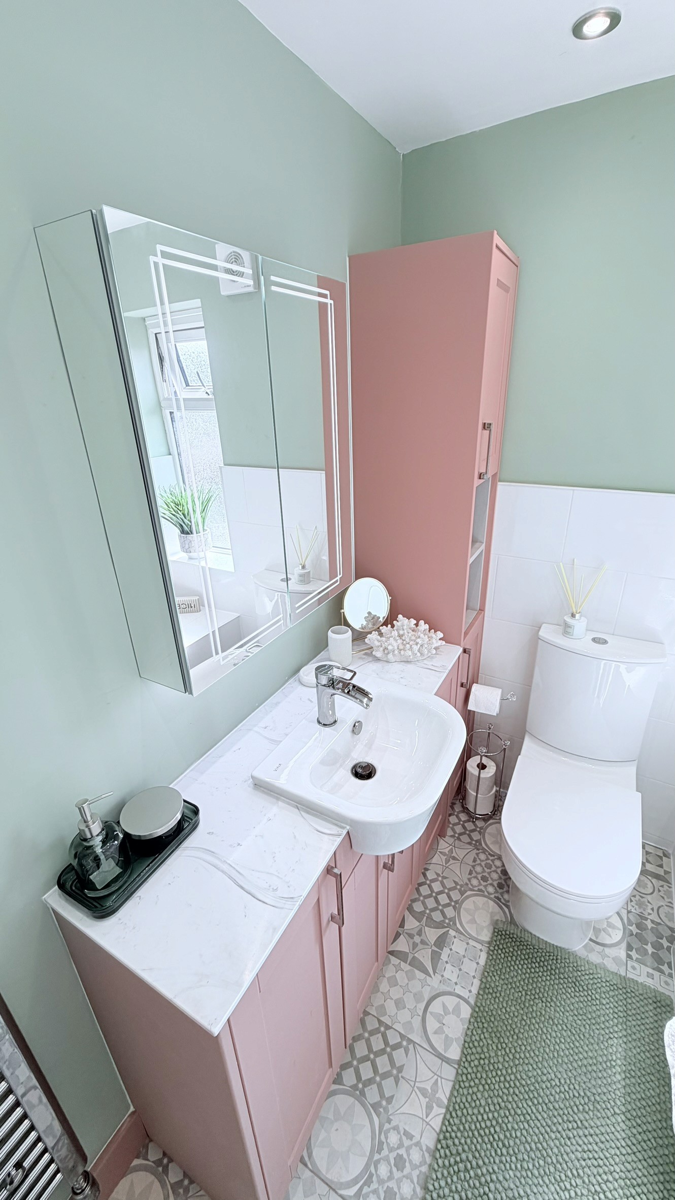 A compact bathroom transformed into a calm, functional space through thoughtful design. Soft green tones, bespoke storage, and statement flooring work together to maximise both style and practicality, proving that small spaces can still feel elevated and intentional.