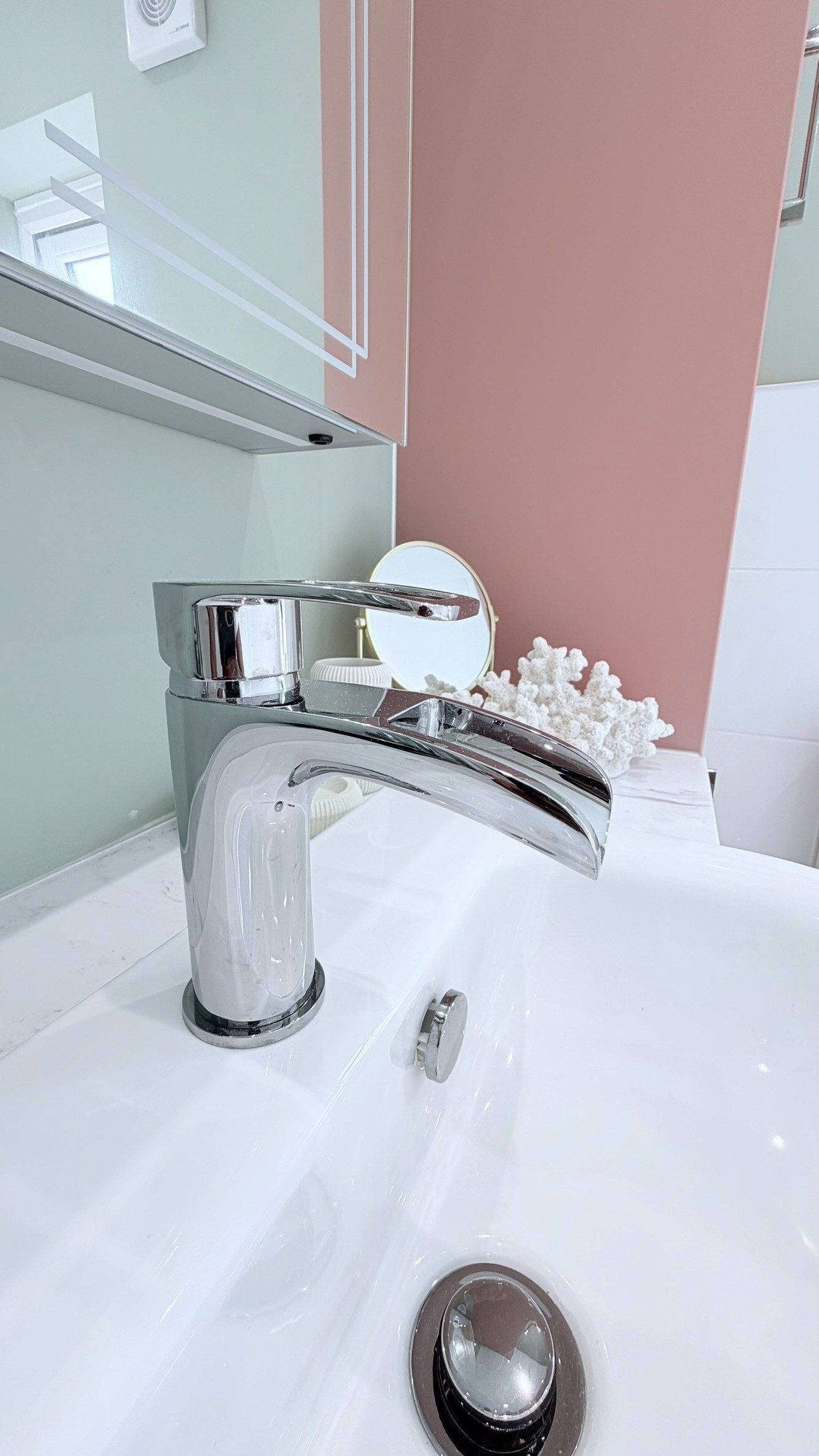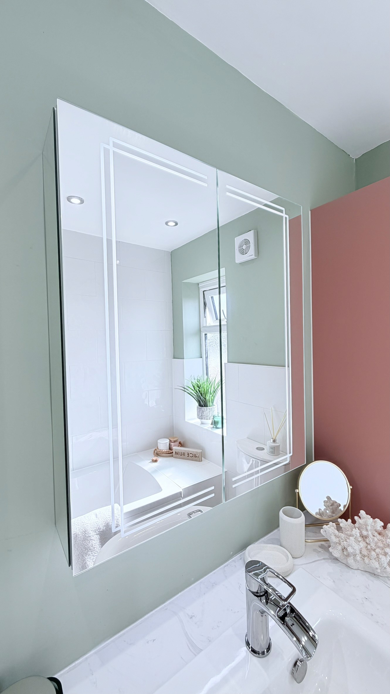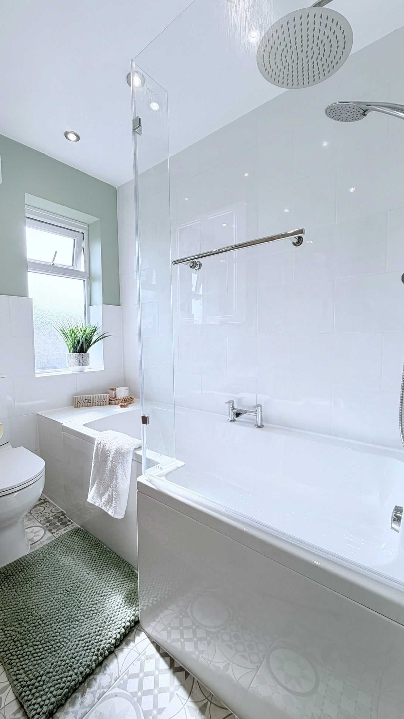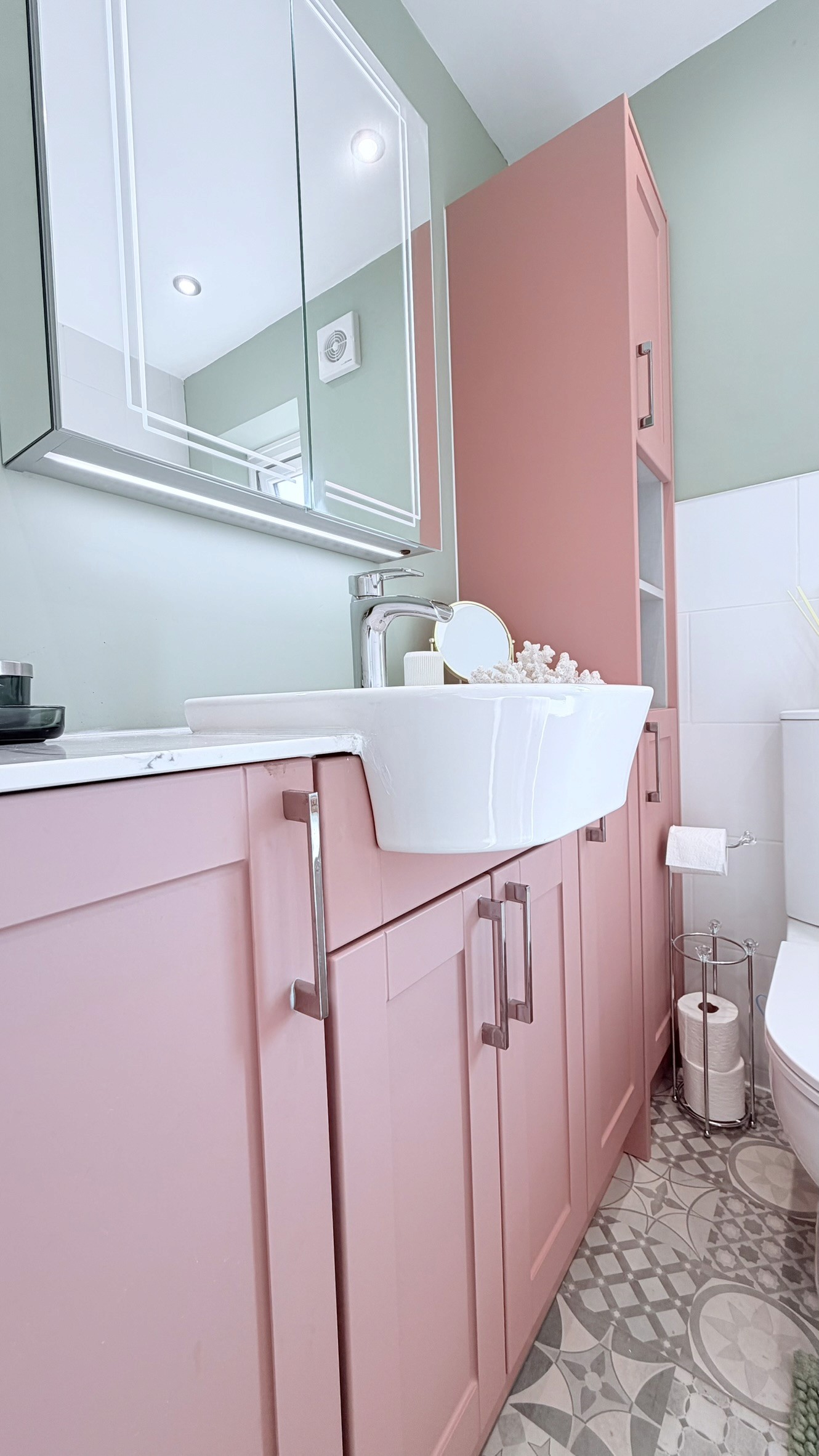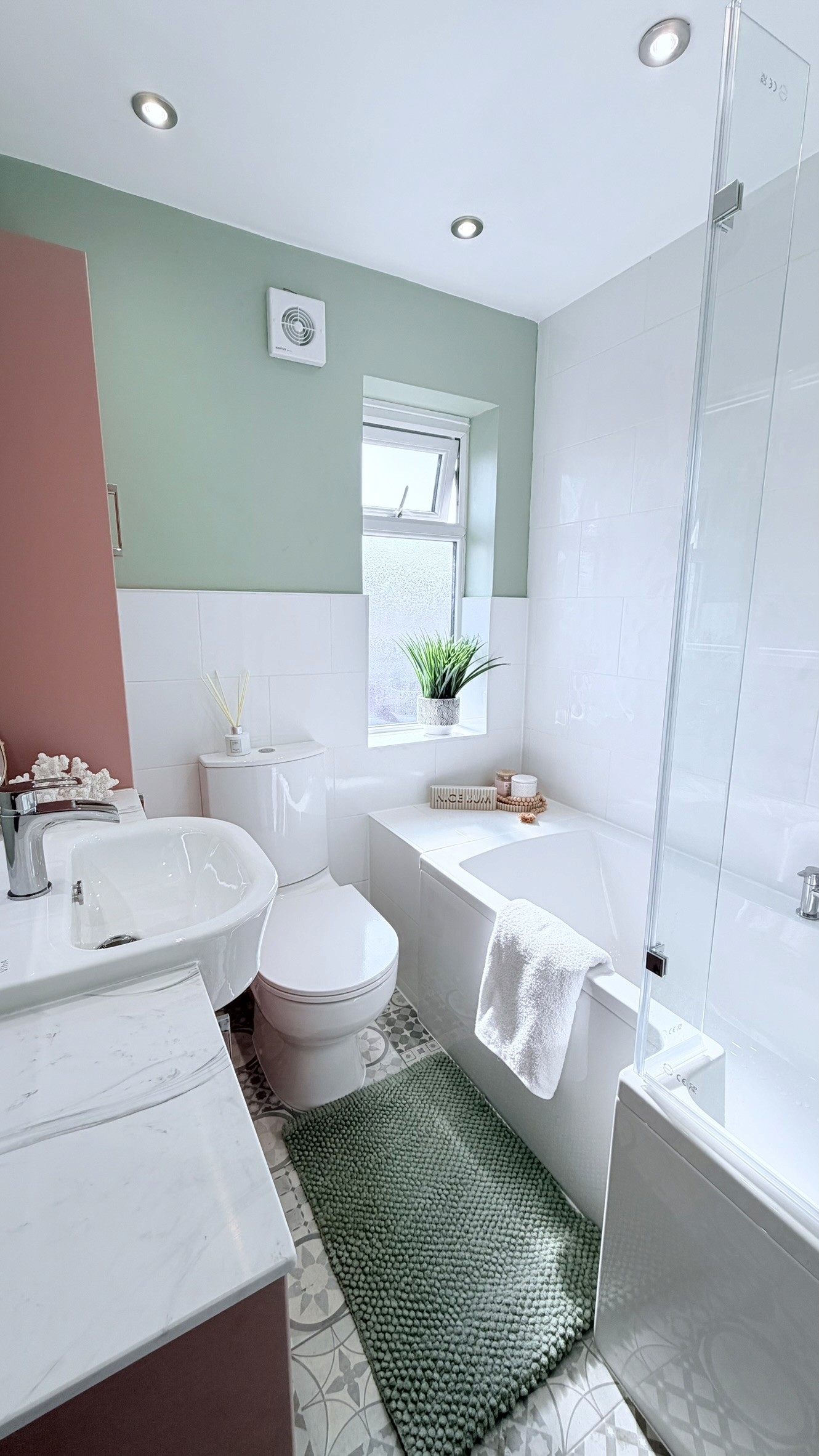 A compact bathroom transformed into a calm, functional space through thoughtful design. Soft green tones, bespoke storage, and statement flooring work together to maximise both style and practicality, proving that small spaces can still feel elevated and intentional.